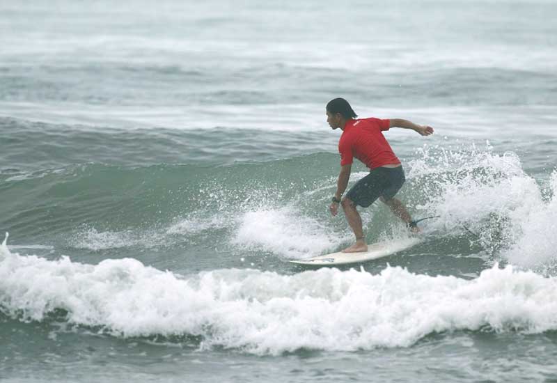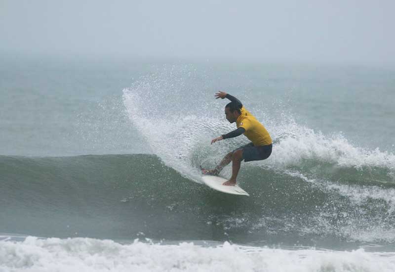 台風の接近により、天候と海の状況が不安定な状況下、サーフ大会の開催が危ぶまれました。当日の朝、地元の人々やジャッジたちの協議の結果、予定通り開催されることになりました。